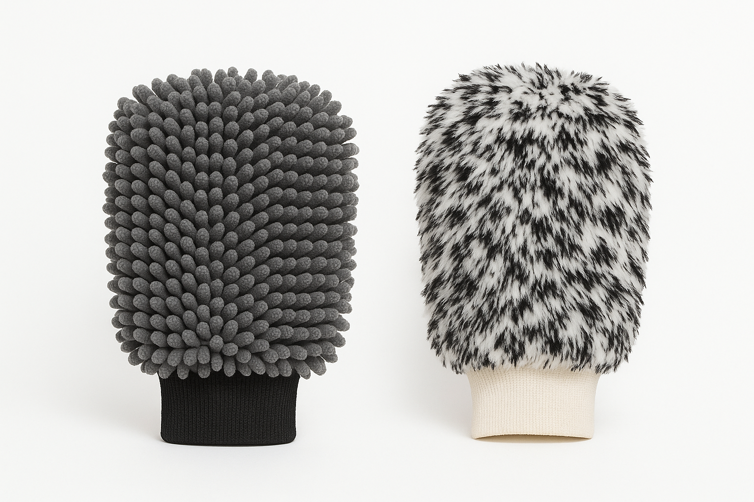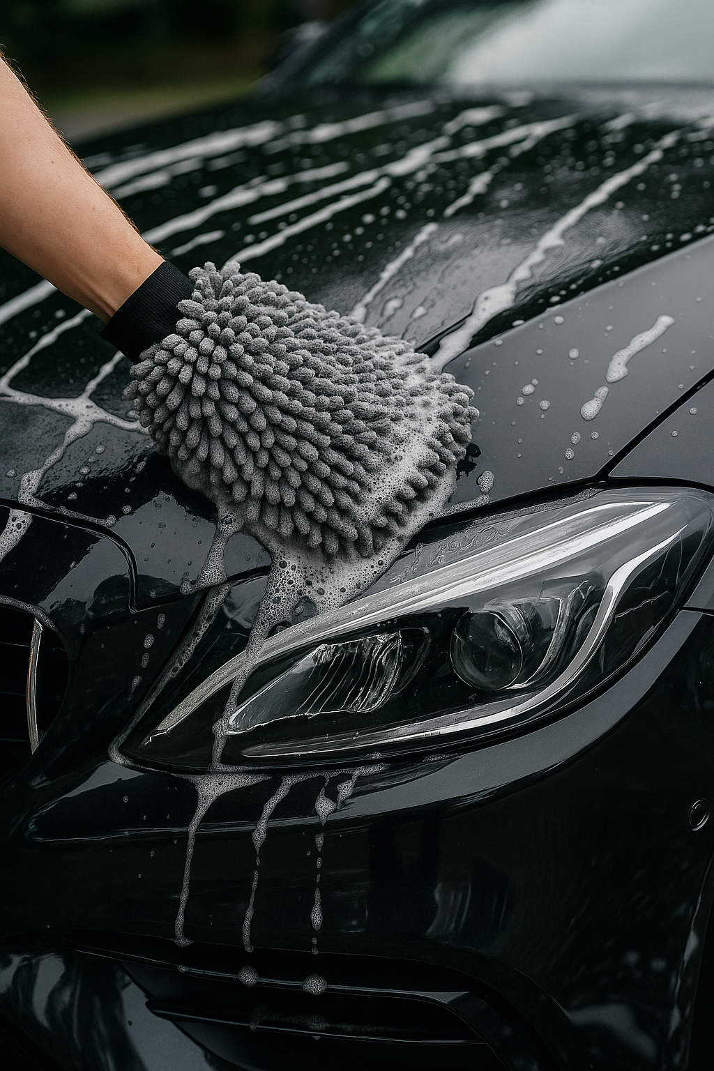 Der graue Mikrofaser-Handschuh reinigt gründlich und schonend. Die weichen Chenille-Fasern nehmen Schmutz auf, ohne den Lack zu verkratzen – perfekt für die Hauptwäsche.