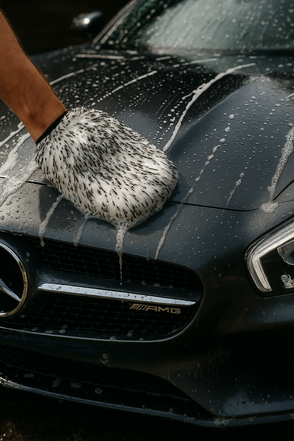 Der weiße Mikrofaser-Handschuh gleitet sanft über den Lack und sorgt für streifenfreien Glanz. Ideal für empfindliche Oberflächen und das Finish nach der Wäsche.